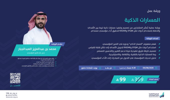 أعلنت الجمعية التعاونية للتميز المؤسسي عن تنظيم ورشة عمل تدريبية متخصصة بعنوان “المسارات الذكية”، والتي تهدف إلى تطوير أداء المشاركين وتعزيز مهاراتهم باستخدام أدوات متقدمة مثل EFQM وRADAR.