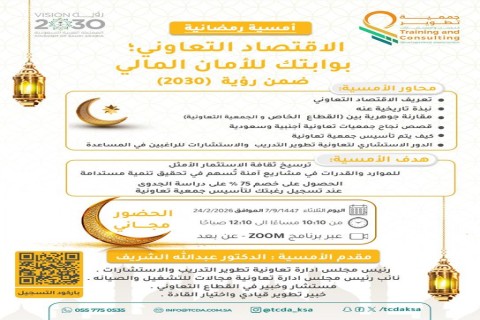 تُنظّم تعاونية تطوير التدريب والاستشارات أمسية رمضانية مجانية بعنوان “الاقتصاد التعاوني: بوابتك للأمان المالي ضمن رؤية 2030”، وذلك عبر منصة زووم، يوم الثلاثاء الموافق 24 / 2 /2026م. تهدف الأمسية إلى ترسيخ ثقافة الاستثمار الأمثل للموارد والقدرات في مشاريع آمنة، تُسهم في تحقيق تنمية مستدامة، كما تتيح للمشاركين الحصول على خصم يصل إلى 75% على دراسة الجدوى عند تسجيل رغبتهم في تأسيس جمعية تعاونية. وتتضمن محاور الأمسية: تعريف الاقتصاد التعاوني ونبذة تاريخية عنه، والمقارنة بين القطاع الخاص والجمعية التعاونية، وعرض لقصص نجاح تعاونية أجنبية وسعودية، فضلاً عن شرح آلية تأسيس الجمعيات التعاونية، والدور الاستشاري للجمعية في دعم الراغبين بالمساعدة. يُقدّم الأمسية الدكتور عبدالله الشريف، رئيس مجلس إدارة الجمعية، ونائب رئيس مجلس إدارة مجالات للتشغيل والصيانة، ومستشار وخبير في القطاع التعاوني.