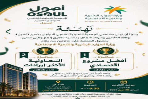 حققت الجمعية التعاونية لمنتجي الدواجن بعسير “أصول” إنجازاً مزدوجاً بحصولها على جائزتين من وزارة الموارد البشرية والتنمية الاجتماعية، هما: جائزة أفضل مشروع اقتصادي، وجائزة التعاونية الأكثر إيرادات، وذلك لعام 2025. ويعكس هذا التتويج كفاءة العمل التعاوني الذي تنتهجه الجمعية، والتزامها بتحقيق أثر اقتصادي مستدام يسهم في تعزيز الأمن الغذائي، بوصفها نموذجاً ناجحاً في القطاع التعاوني الزراعي. ويُقام حفل التكريم يوم الخميس الموافق 30 أبريل 2026، الساعة التاسعة والنصف مساءً، في مقر وزارة الموارد البشرية والتنمية الاجتماعية بأبراج غرناطة - الدور الثاني.