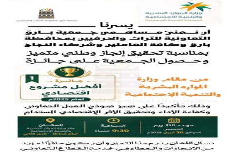 جمعية بارق التعاونية للتراث والحرفيين تحصد جائزة أفضل مشروع اقتصادي لعام 2025