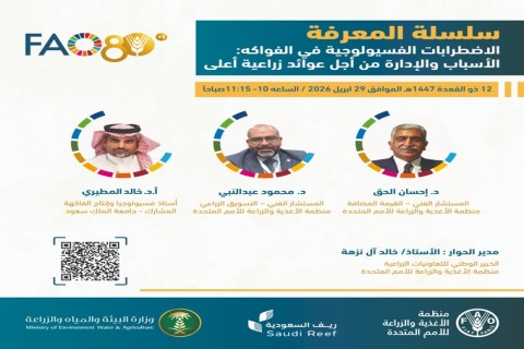 تنظم منظمة الأغذية والزراعة للأمم المتحدة (الفاو) جلسةً علميةً متخصصةً ضمن “سلسلة المعرفة”، وذلك يوم الأربعاء الموافق 29 أبريل 2026، بين الساعة العاشرة والحادية عشرة وربع صباحاً عبر منصة زوم. تتناول الجلسة موضوع “الاضطرابات الفسيولوجية في الفواكه: الأسباب والإدارة من أجل عوائد زراعية أعلى”، وتأتي في إطار برنامج التعاون الفني بين المنظمة ووزارة البيئة والمياه والزراعة، وبالشراكة مع جامعة الملك سعود. يشارك في الجلسة نخبة من الخبراء، في مقدمتهم الأستاذ الدكتور خالد المطيري، أستاذ فسيولوجيا وإنتاج الفاكهة بجامعة الملك سعود، والدكتور إحسان الحق والدكتور محمود عبدالنبي، المستشاران الفنيان لدى المنظمة. ويتولى إدارة الحوار الأستاذ خالد آل نزهة، الخبير الوطني للتعاونيات الزراعية بالمنظمة.