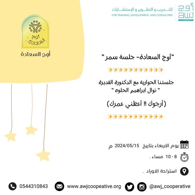 تنظم جمعية أوج التعاونية للتدريب والتطوير والاستشارات جلسة حوارية بعنوان ( أرجوك !! أعطني عمرك ) حضورياً للنساء فقط ، يوم الأربعاء الموافق 15 مايو 2024م، تقدمها الدكتورة / نوال ابراهيم الحلوه ، من الساعة 8 حتى 10 مساءَ، في استراحة الأوراد.