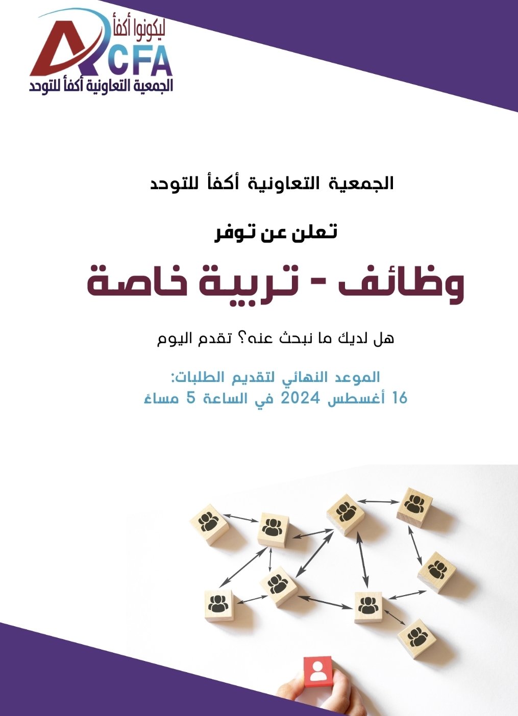 أعلنت الجمعية التعاونية أكفأ للتوحد عن توفر فرص عمل في مجال التربية الخاصة، تدعو الجمعية المهتمين للتقدم لوظيفة أخصائي/ة تربية خاصة، حيث تشترط المؤهلات التالية شهادة جامعية في التربية الخاصة أو التخصصات ذات الصلة، خبرة في العمل مع ذوي الاحتياجات الخاصة "التوحد"، القدرة على العمل ضمن فريق متعدد التخصصات، مهارات تواصل وتعامل ممتازة، متدرب 70 ساعة تخاطب، حيث تقدم الجمعية للموظفين بيئة عمل داعمة تهدف لتوفير أفضل الخدمات لأطفال التوحد وفرص تطوير مهني مستمرة، الموعد النهائي لتقديم الطلبات هو 16 أغسطس 2024م ،على الراغبين في التقدم إرسال سيرهم الذاتية إلى البريد الإلكتروني: contactus@acfaco.com