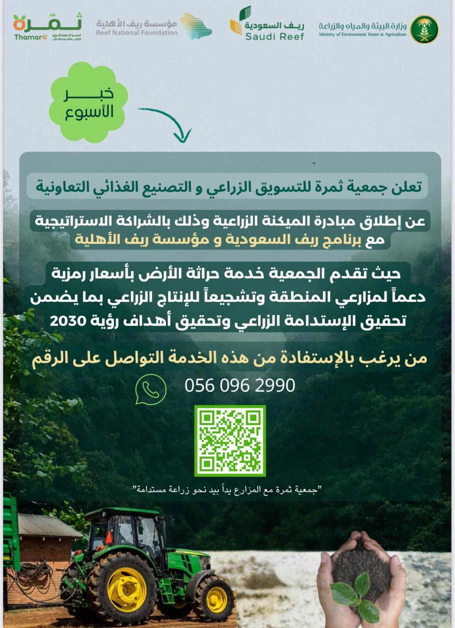 أعلنت جمعية ثمرة للتسويق الزراعي والتصنيع الغذائي التعاوني عن إطلاق مبادرة زراعية استراتيجية طموحة بالشراكة مع برنامج ريف السعودية ومؤسسة ريف الأهلية، تحت رعاية وزارة البيئة والمياه والزراعة.