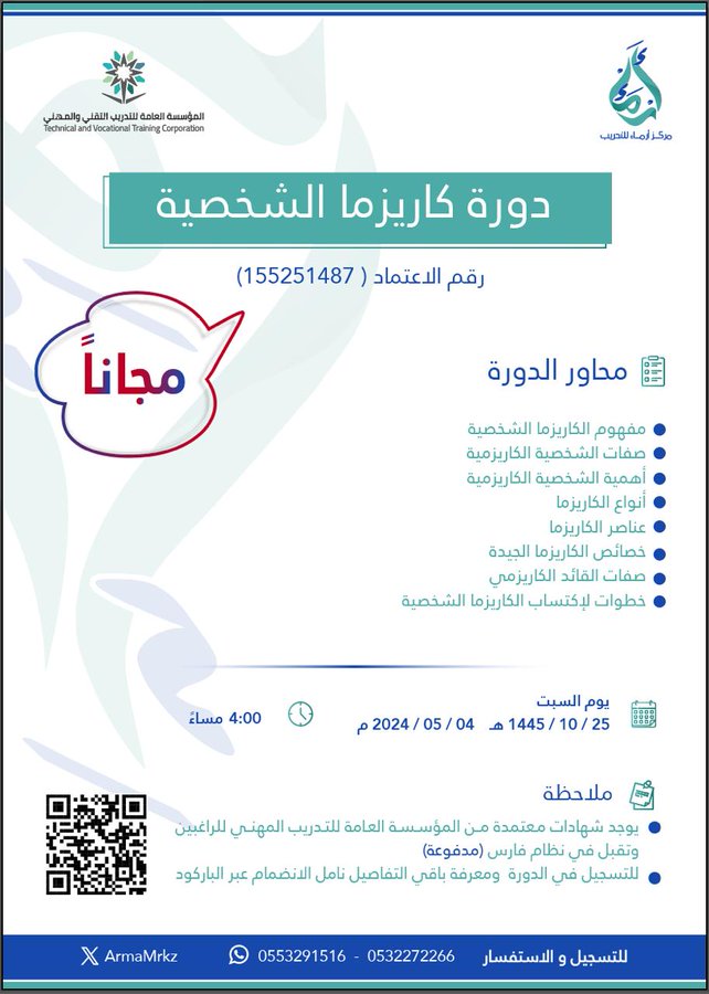 أقامت إرماء التعاونية للتنمية البشرية دورة كاريزما الشخصية يوم السبت الموافق 2024/05/04 م ، قدمتها أ. وفاء العتيبي ، محاور الدورة مفهوم الكاريزما الشخصية ،صفات الشخصية الكاريزمية ، أهمية الشخصية الكاريزمية، أنواع الكاريزما، عناصر الكاريزما، خصائص الكاريزما الجيدة، صفات القائد الكاريزمي، خطوات لاكتساب الكاريزما الشخصية، تعد إرماء جمعية تعاونية للتنمية البشرية تقدم التدريب والاستشارات والخدمات الخاصة بمجال التنمية البشرية.