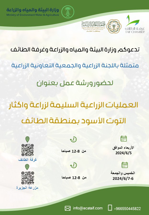 تقيم وزارة البيئة والمياه والزراعة وغرفة الطائف متمثلة باللجنة الزراعية والجمعية التعاونية الزراعية بالطائف ورشة عمل بعنوان العمليات الزراعية السليمة لزراعة وإكثار التوت الأسود بمنطقة الطائف يوم الأربعاء الموافق 5 يونيو 2024م في غرفة الطائف ، و يومي الخميس والجمعة 6-7 يونيو 2024م في مزرعة الجزيرة، من الساعة 8 إلى 12 صباحًا.