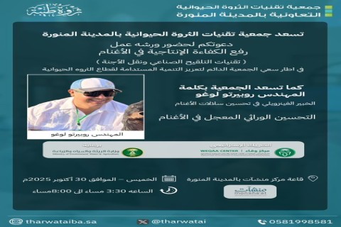 نظمت جمعية تقنيات الثروة الحيوانية التعاونية بالمدينة المنورة “ثروة طيبة” ورشة عمل متخصصة بعنوان “رفع الكفاءة الإنتاجية في الأغنام - التلقيح الصناعي ونقل الأجنة”، وذلك يوم الخميس الموافق 30 أكتوبر 2025، في قاعة مركز منشآت بالمدينة المنورة. وشهدت الورشة، التي استمرت من الساعة الرابعة مساءً وحتى الساعة الثامنة مساءً، حضوراً واسعاً من الجهات الحكومية والبيطريين والمربين والمستثمرين والمهتمين بقطاع الثروة الحيوانية. وقدم الورشة المهندس روبرتو لوغو، الخبير الفنزويلي المتخصص في تحسين سلالات الأغنام والتحسين الوراثي المعجل في الأغنام، حيث استعرض أحدث التقنيات والممارسات العلمية في مجال التلقيح الصناعي ونقل الأجنة. وتأتي هذه الورشة في إطار سعي الجمعية الدائم لتعزيز التنمية المستدامة لقطاع الثروة الحيوانية، ورفع مستوى الكفاءة الإنتاجية للمربين في المنطقة، بما يتماشى مع أهداف التنمية الزراعية في المملكة.