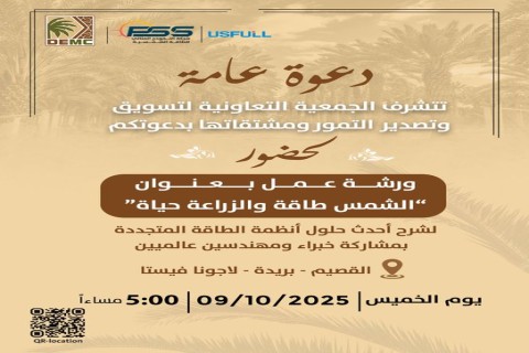 تعلن تعاونية تسويق وتصدير التمور ومشتقاتها عن تنظيم ورشة عمل متخصصة بعنوان “الشمس طاقة والزراعة حياة”، وذلك يوم الخميس الموافق 09/10/2025 في تمام الساعة 5:00 مساءً. تهدف الورشة إلى شرح أحدث حلول أنظمة الطاقة المتجددة في القطاع الزراعي، وذلك بمشاركة خبراء ومهندسين عالميين متخصصين في مجال الطاقة الشمسية وتطبيقاتها في الزراعة الحديثة. وستُعقد الورشة في منطقة القصيم ، حيث يتم دعوة جميع المهتمين من المزارعين وأصحاب المشاريع الزراعية والمختصين للحضور والاستفادة من هذه الفعالية المهمة. وتأتي هذه المبادرة في إطار حرص الجمعية على تطوير القطاع الزراعي وتعزيز استخدام الطاقة النظيفة والمستدامة في الزراعة، بما يسهم في خفض التكاليف التشغيلية وتحسين الإنتاجية الزراعية. للمزيد من المعلومات والتسجيل، يمكن التواصل مع الجمعية عبر حساباتها الرسمية أو مسح رمز الاستجابة السريعة المرفق بالدعوة.