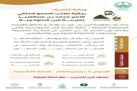 تدعو تعاونية البن بجازان المزارعين والمهتمين للمشاركة في ورشة تعريفية خاصة بجائزة صاحب السمو الملكي الأمير محمد بن عبدالعزيز لمزرعة البن النموذجية، وذلك يوم الخميس الموافق 4 ديسمبر 2025م في تمام الساعة التاسعة صباحاً بمعهد البن للتدريب – مقر أمانة الجائزة. وتهدف الورشة إلى تقديم شرح شامل عن الجائزة ومعاييرها ومسارات الترشح المتاحة للمزارعين والمهتمين، حيث تتضمن التعريف بالجائزة ورؤيتها وأهدافها، واستعراض معايير التقييم ومسارات الجائزة، وشرح آلية الترشح وخطوات التسجيل، بالإضافة إلى الإجابة عن استفسارات الحضور. كما تشمل الورشة التعريف بالمسارات المتاحة والتي تتضمن الممارسات الزراعية المستدامة، والابتكار في تقنيات الحصاد والمعالجة، والقيمة المضافة والصناعات التحويلية، والتنمية السياحية الريفية. وتأتي هذه المبادرة ضمن جهود تعاونية البن بجازان لتطوير قطاع البن وتشجيع المزارعين على تبني أفضل الممارسات الزراعية والارتقاء بجودة الإنتاج المحلي.