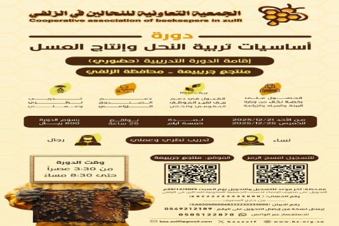 تعلن الجمعية التعاونية للنحالين في الزلفي عن إقامة دورة تدريبية متخصصة في أساسيات تربية النحل وإنتاج العسل، وذلك في منتجع جريبيعة بمحافظة الزلفي. تستهدف الدورة جميع الراغبين في دخول مجال تربية النحل من الرجال والنساء، حيث سيتم تنظيم تدريب نظري وعملي منفصل لكل فئة. تنطلق الدورة التدريبية يوم 21 / 12 /2025م وتستمر لمدة خمسة أيام حتى 25 / 12 / 2025م، بواقع 25 ساعة تدريبية. وقد حددت الجمعية رسوم المشاركة في الدورة بمبلغ 600 ريال سعودي. تقام الدورة من الساعة 3:30 عصراً حتى الساعة 8:30 مساءً. ويمكن للراغبين في التسجيل التواصل مع الجمعية عبر الأرقام المخصصة أو من خلال الرابط الإلكتروني المتاح على موقع الجمعية الرسمي وحساباتها على وسائل التواصل الاجتماعي. تأتي هذه المبادرة في إطار حرص الجمعية التعاونية للنحالين في الزلفي على نشر الوعي بأهمية تربية النحل وتطوير مهارات النحالين في المنطقة، ودعم الراغبين في بدء مشاريعهم الخاصة في هذا المجال الحيوي الذي يساهم في تعزيز الأمن الغذائي وتنمية الاقتصاد المحلي.