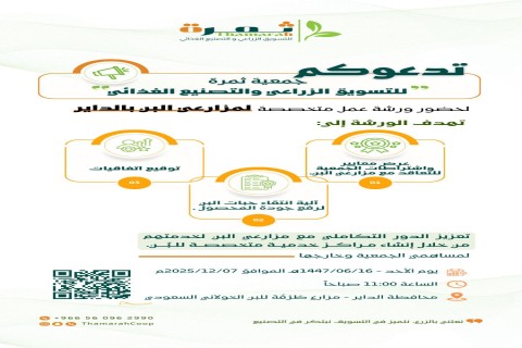 أعلنت جمعية ثمرة للتسويق الزراعي والتصنيع الغذائي عن تنظيم ورشة عمل متخصصة لمزارعي البن بمحافظة الداير، وذلك يوم الأحد 16 جمادى الآخرة 1447هـ الموافق 7 ديسمبر 2025م، في تمام الساعة الحادية عشرة صباحاً بمزارع طارقة للبن الدولتي السعودي. تهدف الورشة إلى تعزيز الدور التكاملي مع مزارعي البن لخدمتهم من خلال إنشاء مراكز خدمية متخصصة للبن، وتستهدف تحقيق ثلاثة محاور رئيسية تشمل عرض معايير واشتراطات الجمعية للتعاقد مع مزارعي البن، وشرح آلية انتقاء حبات البن لرفع جودة المحصول، إضافة إلى توقيع الاتفاقيات . وتأتي هذه المبادرة في إطار حرص الجمعية على دعم مزارعي البن المحليين وتطوير قطاع إنتاج البن في المنطقة، من خلال تقديم الدعم الفني والإرشادي اللازم لتحسين جودة المحاصيل وتسهيل عمليات التسويق والتصنيع.