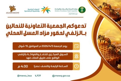 تدعو الجمعية التعاونية للنحالين بالزلفي عموم المهتمين وهواة العسل الأصيل إلى حضور فعالية مزاد العسل المحلي، التي تُقام يوم الجمعة الموافق 3 أبريل 2026م، الساعة الرابعة والنصف عصراً. وتُعقد الفعالية في السوق المركزي للخضار والفواكه بالزلفي الواقع على طريق الملك فهد، وتُتيح للزوار فرصة اقتناء أجود أنواع العسل المحلي مباشرةً من النحالين، في تجربة تجمع بين الأصالة والجودة. وتأتي هذه الفعالية في إطار مساعي الجمعية لتعزيز الاقتصاد التعاوني ودعم المنتج المحلي، وتوطيد الصلة بين المنتج والمستهلك.