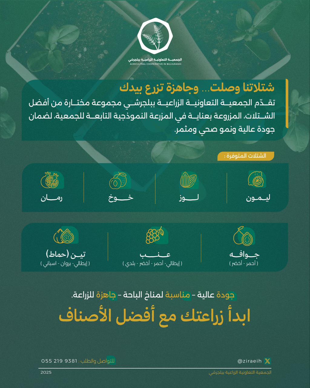 أعلنت الجمعية التعاونية الزراعية ببلجرشي عن توفر مجموعة متنوعة من الشتلات المختارة بعناية فائقة من مزرعة الجمعية النموذجية، حيث تتميز هذه الشتلات بجودتها العالية وجاهزيتها المباشرة للزراعة.